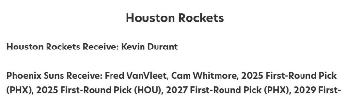 火箭计划用范弗利特、年轻球员和多个未来首轮选秀权作为筹码,试图换来杜兰特的加盟。